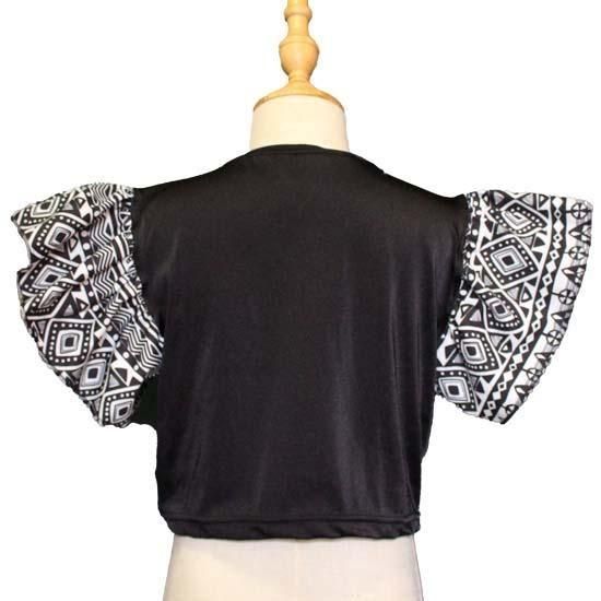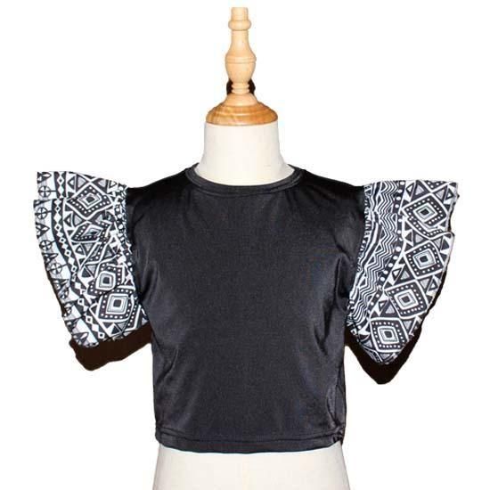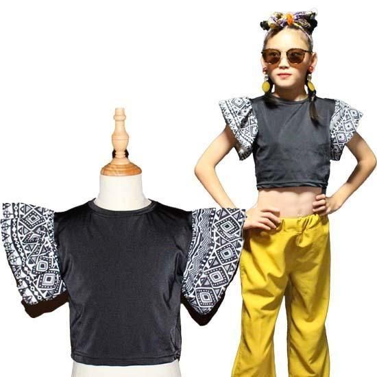 このトップスは、アフリカ柄のフリルスリーブが特徴のショート丈トップスです。シンプルでありながら、その柄やデザインが華やかさをプラスしてくれます。ストレッチ生地を使用しているため、体の動きにもしっかりとついてきてくれるので、ダンスをする際にも快適に着用することができます。