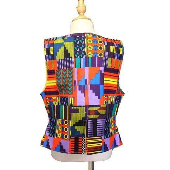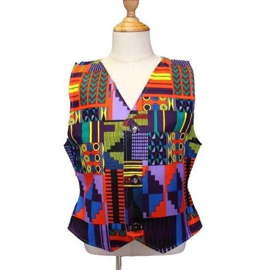 ベストならではの着こなしやすさはそのままに、アフリカ柄の個性的なデザインで差をつけることができます。カジュアルにも、ちょっとしたフォーマルな場面にも活躍するアイテムです。