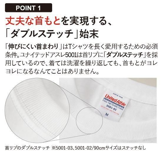リリースから10年以上、United Athleの代表格として人気のシリーズ。業界最多数級のカラーやキッズサイズ・ガールズサイズといった、バリエーションの豊富さはオリジナルTシャツ作成用のベースとして最適です。また、無地のままでも着られるように「よれない・透けない・長持ちする」といった三拍子がそろった上質な一枚に仕上げています。丈夫な首もとを実現するため、首まわりの縫製に「ダブルステッチ」を採用。長年愛用いただいてもきちんとした首まわりを保ちます。